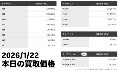 【とみ蔵】本日の貴金属の買取価格(2026年1月22日)金プラチナの買い取り価格と出張買取について2026年1月22日とみ蔵買取センターの金プラチナの新潟県一律の買取価格と出張買取について 金製品 24金1g 24999円 18金1g 18406円 プラチナ製品5356020pt1000 1g 12267円 pt90 […]